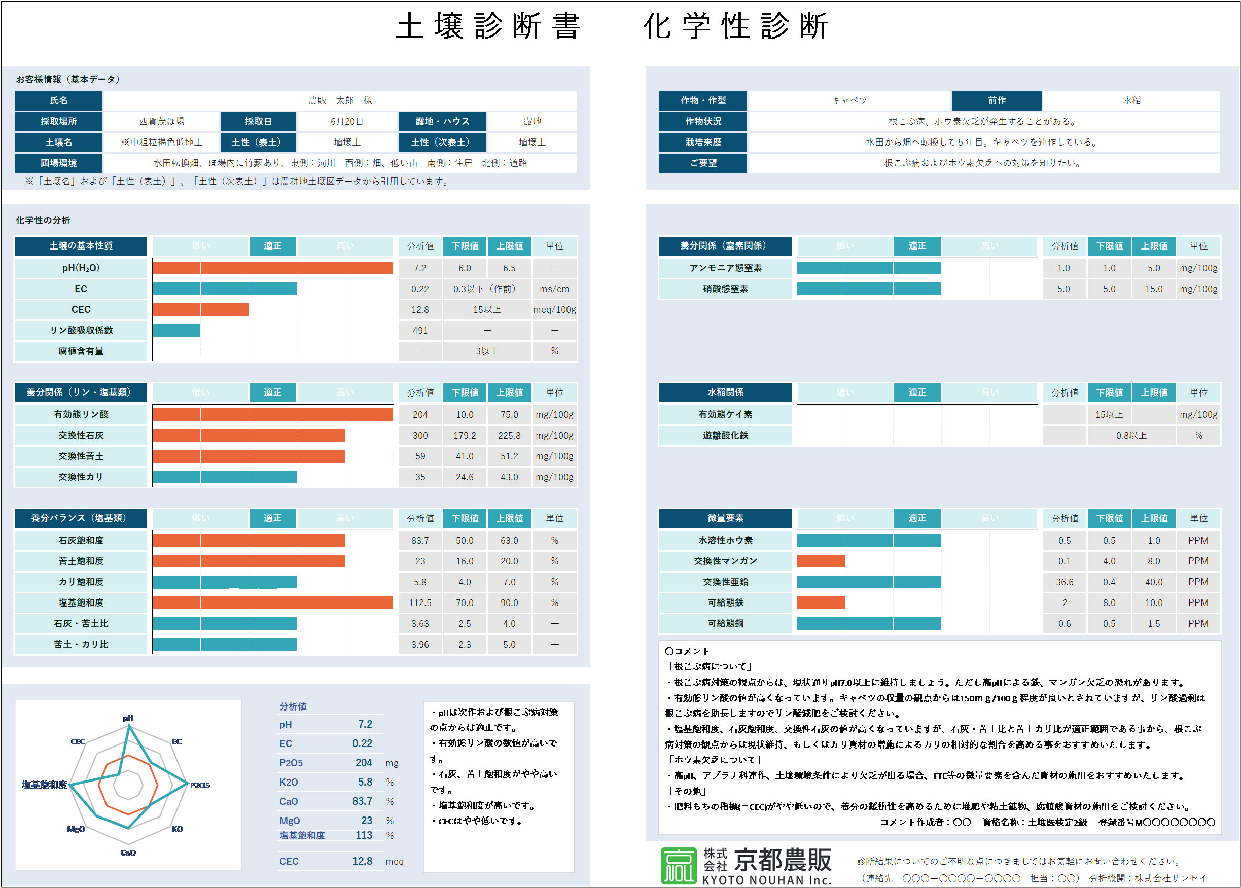 - 【分析項目】pH、EC、有効態リン酸、交換性塩基、石灰 / 苦土比、苦土 / カリ比