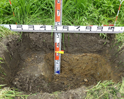 - 圃場に縦横深さ 50cm 内外の穴を掘削し、断面から総合的に診断いたします。
