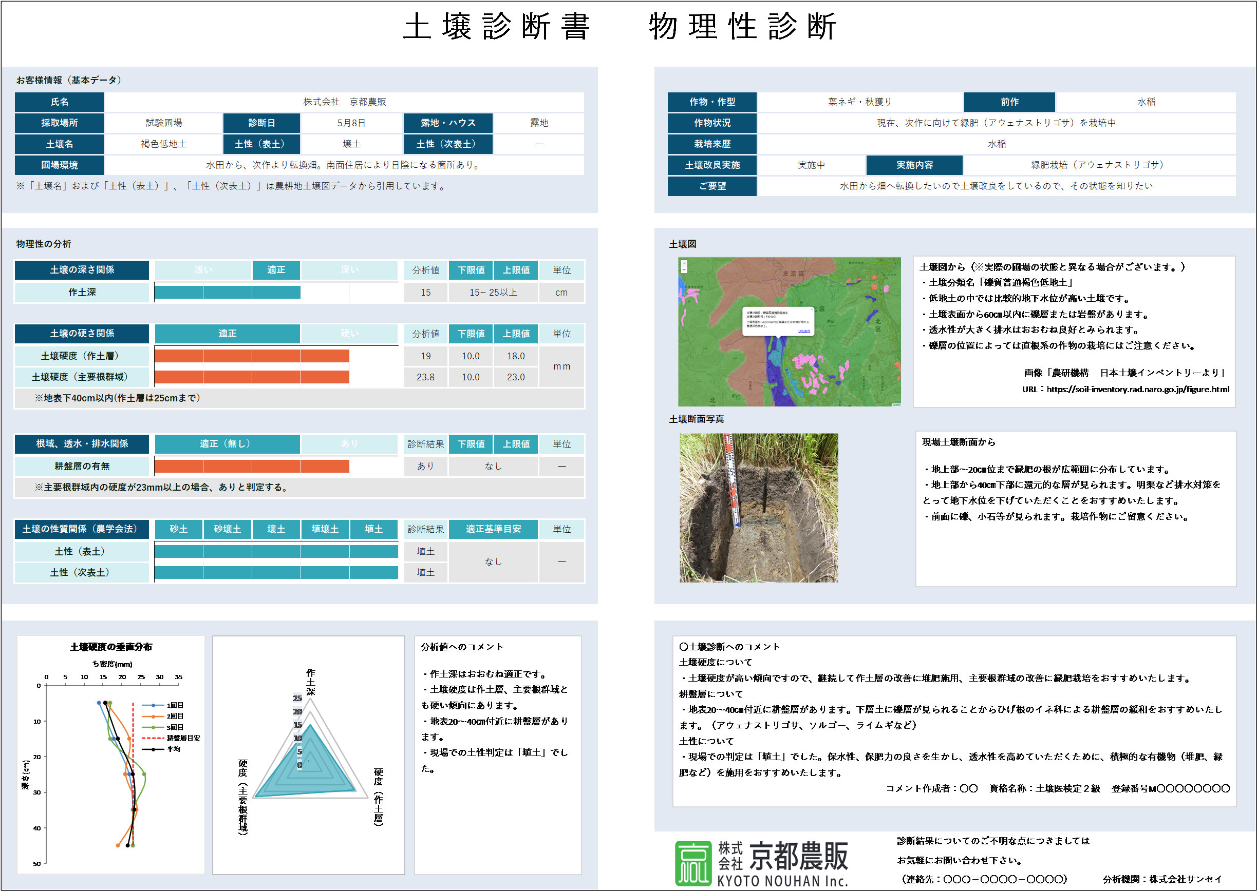 京都農販の土壌診断には「化学性診断」と「物理性診断」がございます。圃場の状態やお悩みなどを伺い、土壌診断のエキスパートが最適なプランをご提案いたします。土壌分析の結果は「土壌診断書」に記載しお渡しいたします。また、診断結果に基づいた施肥設計や資材等のご提案の他、お悩み解決に向けた技術的なアドバイスをいたします。